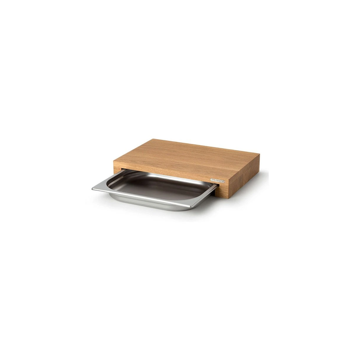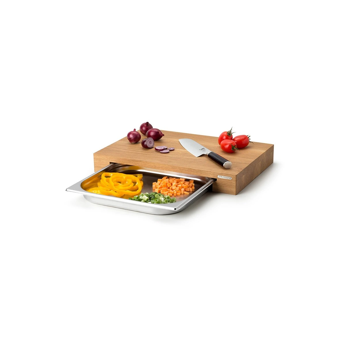 Doska na krájanie z kvalitného tvrdého dreva so zásuvkou z nehrdzavejúcej ocele na odloženie nakrájaných vecí. Výsuvnú zásuvku je možné použiť aj ako plech na pečenie a zapekanie.