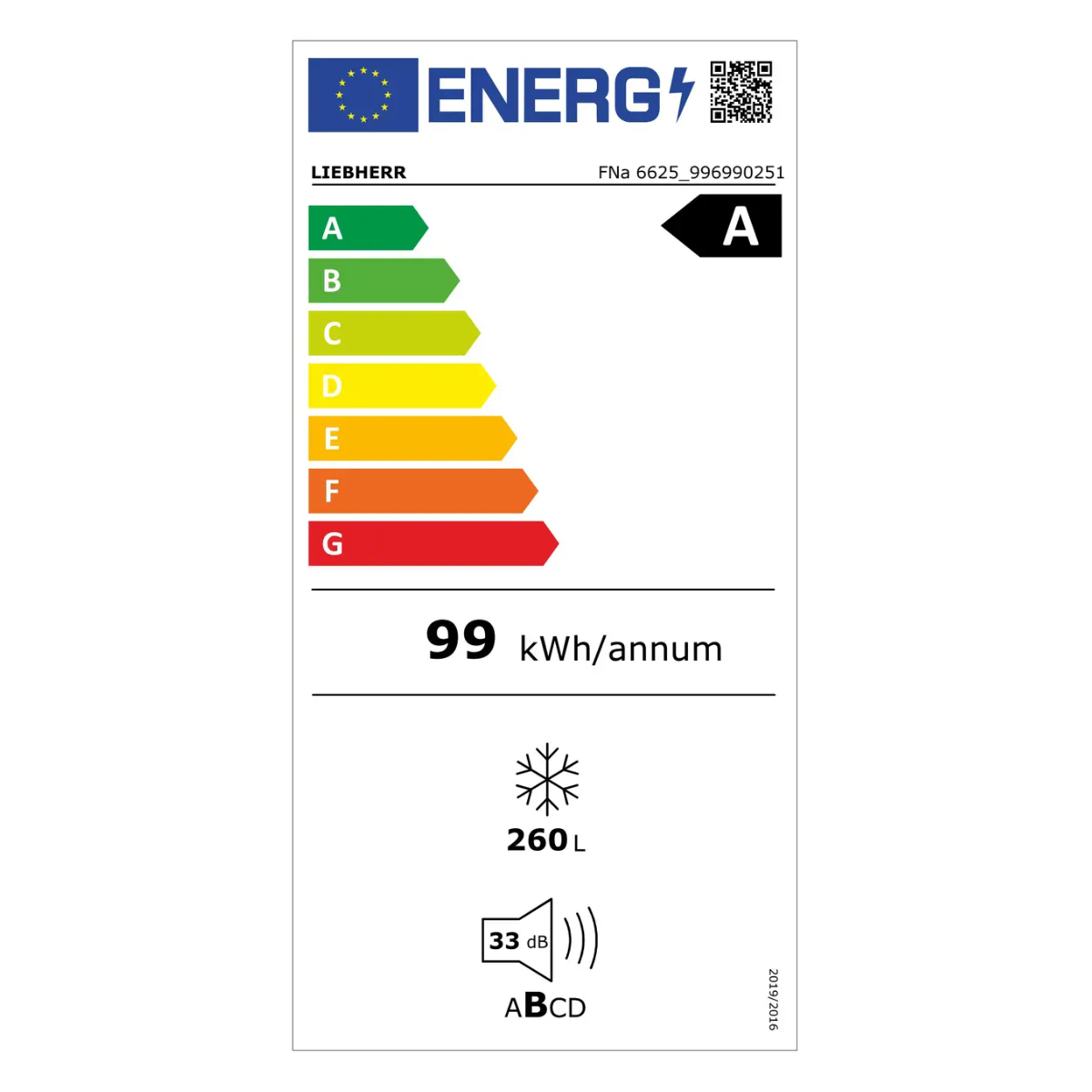 Liebherr FNa 6625 Plus NoFrost kombinuje veľký objem (260 l), beznámrazovú technológiu, LED displej a moderný vzhľad do kompaktného tvaru. Je tichý, úsporný, flexibilný a pripravený na smart domácnosť – je to ideálny doplnkový mraziak pre stredne veľké domácnosti.